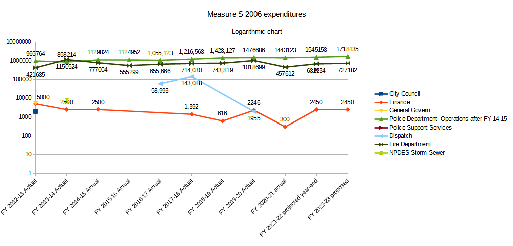 But quite a bit is hidden by the scale of the chart. Here again, the logarithmic chart can be helpful. It’s worth noting again that the amount of change within an order of magnitude is much greater for the higher Y-axis values- the difference between 100,000 and 1,000,000 is much greater than the difference between 1000 and 10,000. It shows us that sewer collection expenditures have remained constant, but relatively low. Recreation Administration expenditures were low, and stopped after FY 17-18. Cable Access TV had one, moderate expenditure in FY 15-16 and none afterwards. Tiny Tots started out a bit above low and declined to low, while Council rose to near-moderate before declining to low. The interesting points that couldn’t be seen in the main graph are the similar growth rates for Administration/Engineering and Park Maintenance after FY 20-21, a spike and decline in funds spent on Police Support Services from FY 19-20 through FY 22-23, leveling out of funds spent at the same level for Information Systems and Police Operations in FY 21-22 and FY 22-23 when they had very different trends prior to that, and the marked decline in expenditures on the Senior Center from FY 21-22 to FY 22-23.