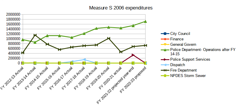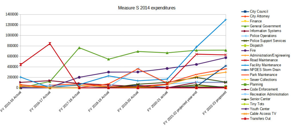 Measure S 2014 is *much* more complicated. Towards the beginning of the tax history, we can see a substantial chunk of funds moved to transfers out, which ends after FY 16-17. We see facility maintenance begin at a moderate level, decline, and then rise until FY 18-19, where it remains roughly stable until FY 20-21. After that it spikes to become the main expenditure category for FY 21-22 and especially FY 22-23. General Government starts off low, spikes to become the main expenditure category in FY 17-18, drops moderately in FY 18-19 and then roughly stabilizes from there between those points. Fire starts off low, but then gradually rises to become the fourth-largest expenditure category by FY 22-23. Park Maintenance has a spike in FY 19-20, drops off sharply in FY 20-21 and then starts rising again in FY 21-22 and FY 22-23. There’s a spike for Road Maintenance in FY 21-22 which is maintained in FY 22-23. And finally, NPDES storm drain expenditures rise markedly in FY 22-23.
